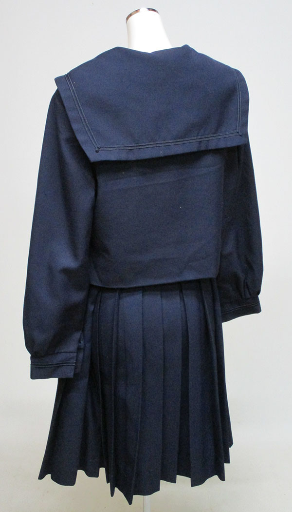 襟等に紺2本ライン、サイドファスナー、紺色スカーフ付、スカートホック無し、ヒダ24本