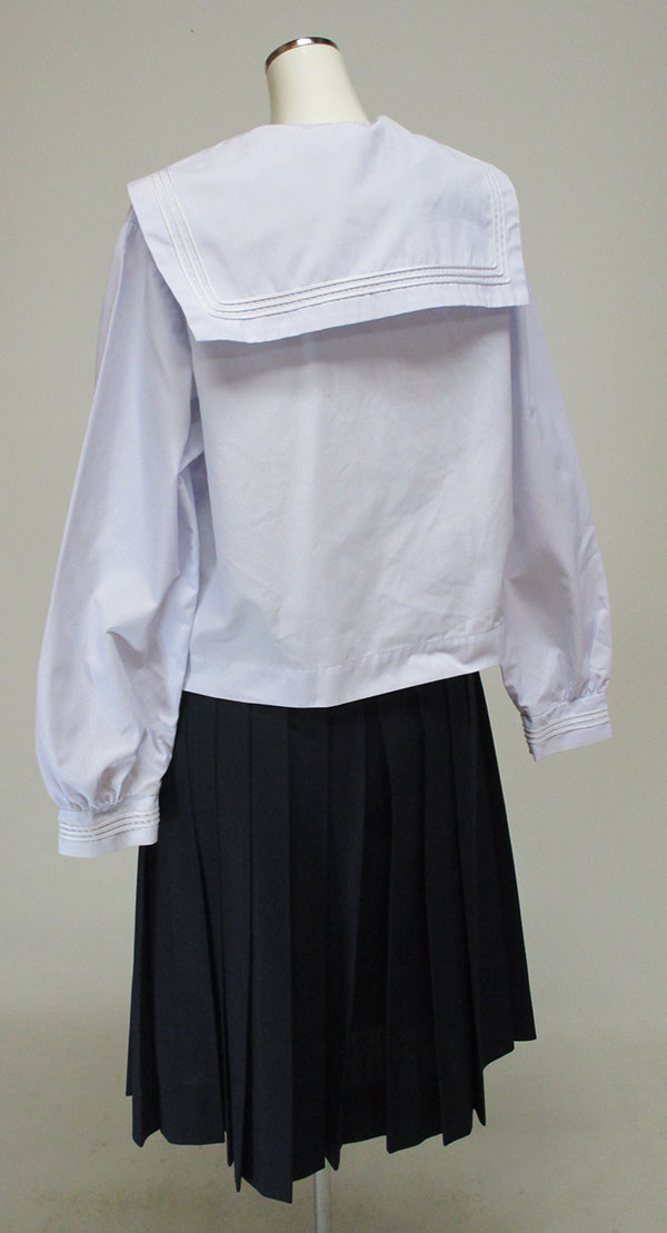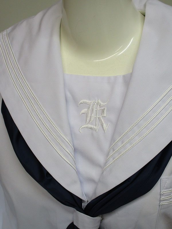 襟等に白3本ライン、紺色スカーフ付、胸当てに刺しゅう、少々シミ汚れあり、サイドファスナー