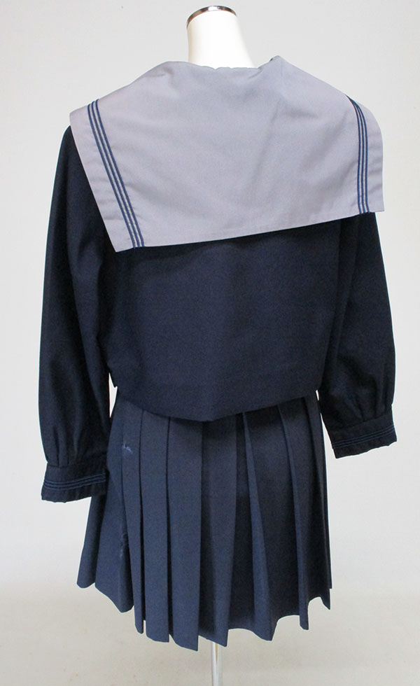 グレー襟カバーに紺3本ライン、サイドファスナー、グレーリボン付、スカートヤブレ・イタミあり