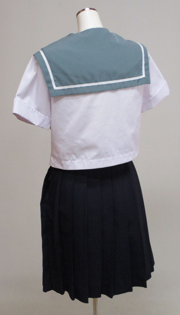 グレー襟に白1本ライン、青色スカーフリボン付、胸当てに刺しゅう、左胸に校名・名前刺しゅう、前スナップ止め、ヒダ20本