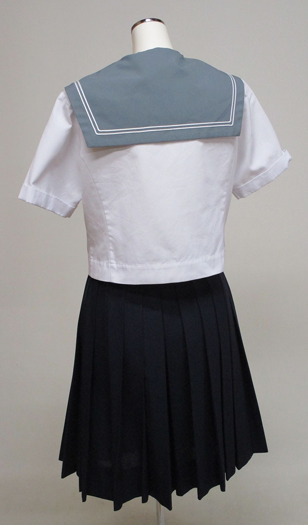 グレー襟に白2本ライン、白色サテンリボン付、胸当てに刺しゅう、胸ポケットに名前刺しゅう、汚れあり、前ファスナー、ヒダ24本