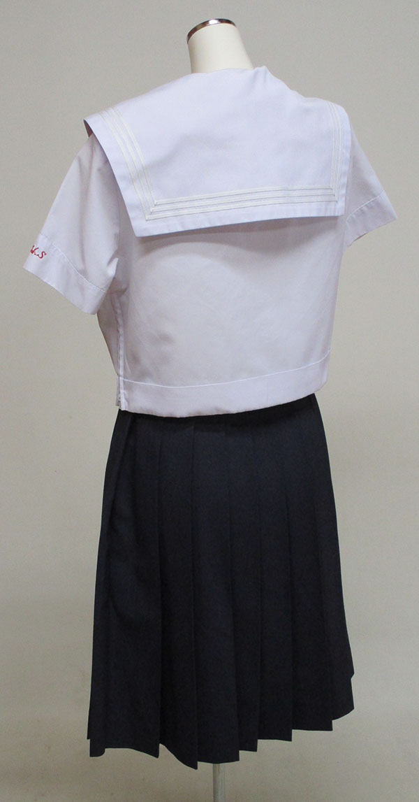 襟に白3本ライン、赤色スカーフ付、左袖に刺しゅう、サイドファスナー、ヒダ24本
