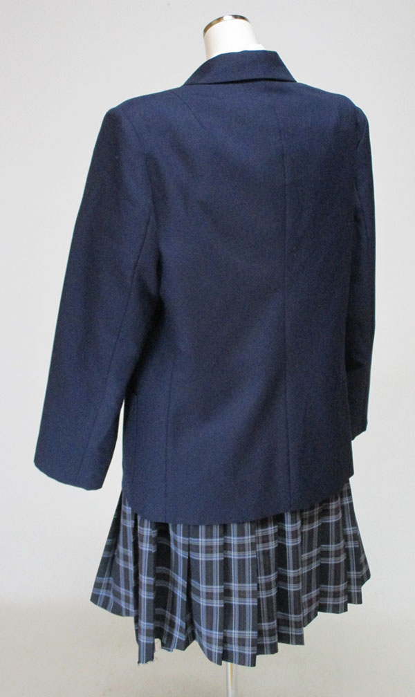 ブレザー:紺、青色サテンリボン付、前ダブル スカート:紺系チェック、裾ほつれあり、ヒダ20本
