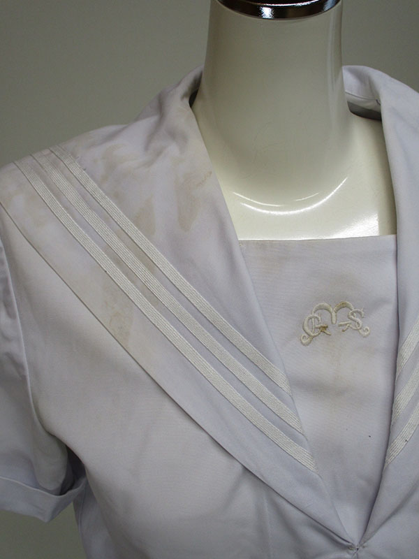 襟に白3本ライン、胸当てに刺しゅう、かぶるタイプ、汚れあり