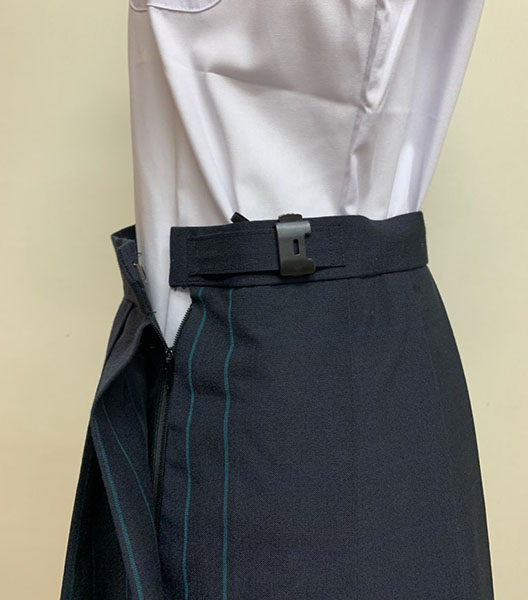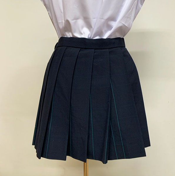 紺×うすくブルーでチェック柄、プリーツ内側と裏はグリーンストライプ柄、ヒダ16本、ポケットあり、スクールタイガー