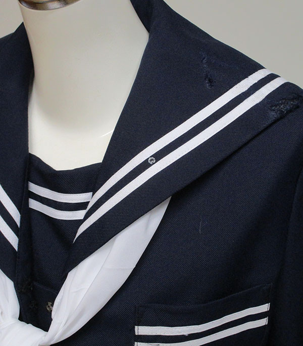 襟に白2本ライン、前スナップ止め、白色スカーフ付、イタミあり、スカートホック無し、ヒダ24本