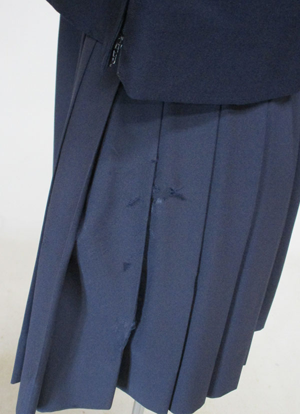 グレー襟カバーに紺3本ライン、サイドファスナー、グレーリボン付、スカートヤブレ・イタミあり
