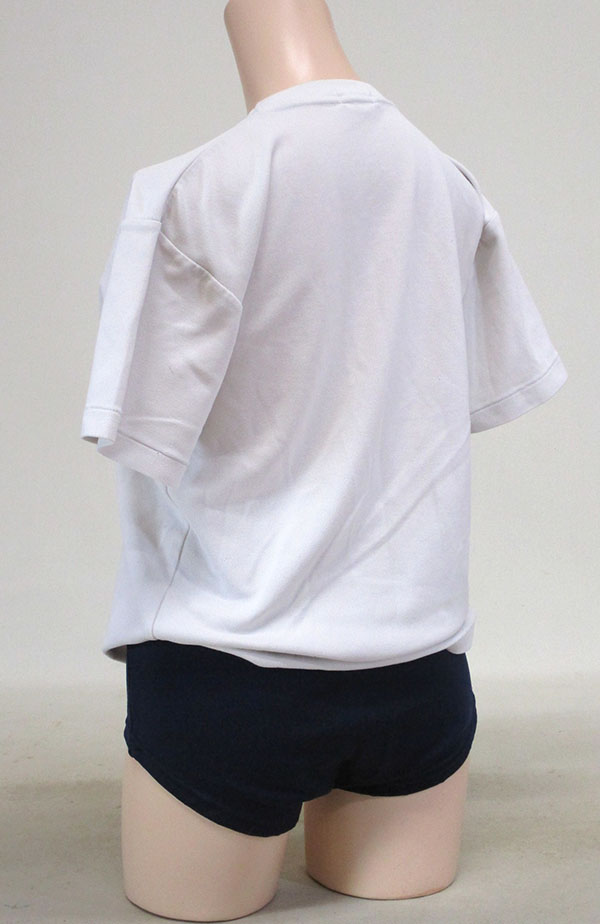 体操服:ポリエステル60%・綿40%、名札付き・校名プリント ブルマー:ポリエステル他、少々ホツレあり、紺