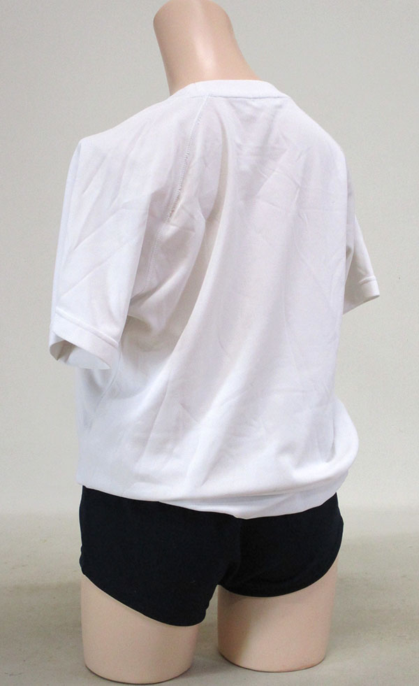 体操服:ポリエステル100%、名前刺しゅう入り・校章プリント、 ブルマー:ナイロン100%、後ろポケット付き、紺