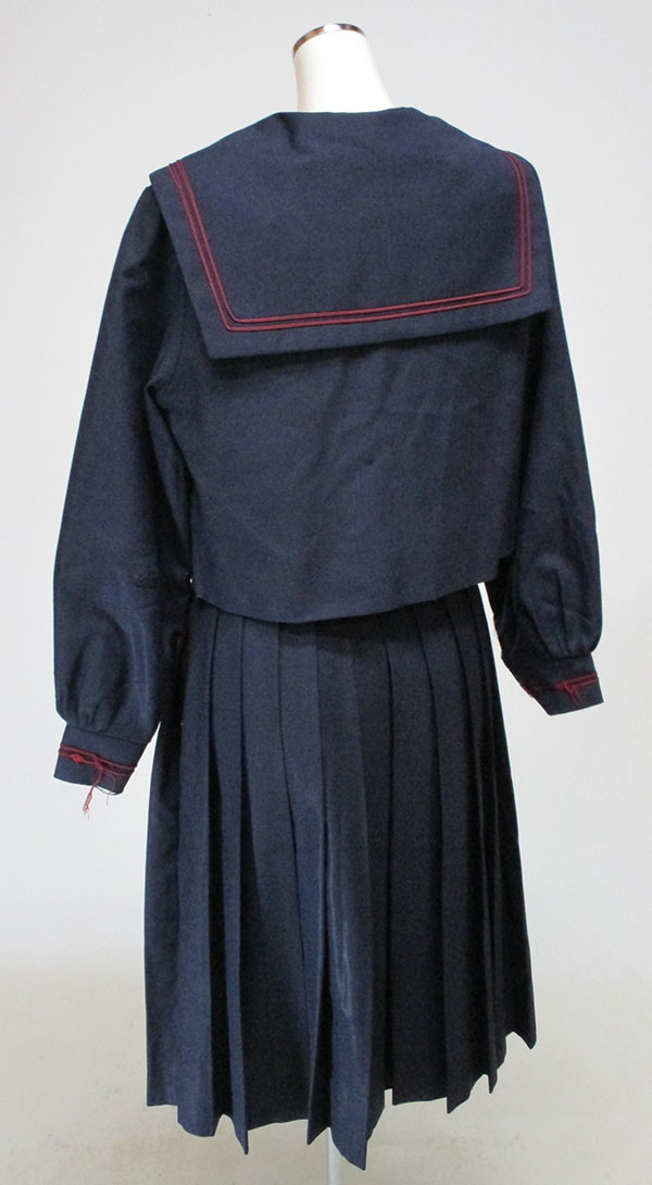 襟等にエンジ2本ライン(袖ラインほつれ)、サイドファスナー、エンジネクタイ付、胸当てに刺しゅう、生地イタミあり、裏地ほつれ・イタミあり、ヒダ24本