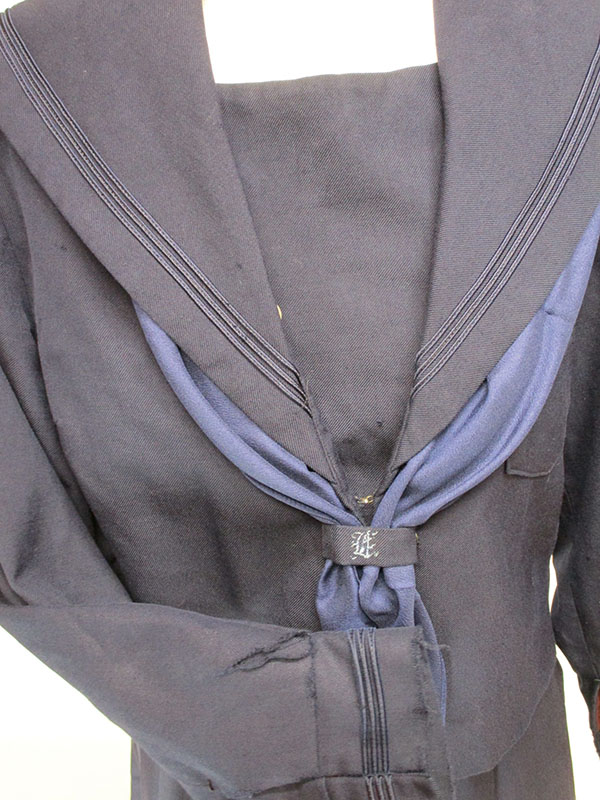 襟等に紺3本ライン、サイドファスナー、紺色スカーフ付、スカーフ止めに刺しゅう、ヤブレ・イタミあり、スカートヤブレ・イタミあり、ヒダ24本