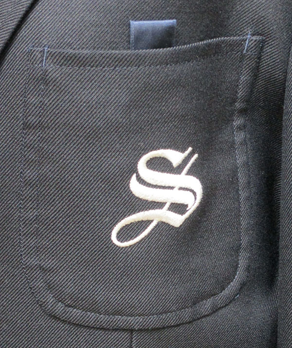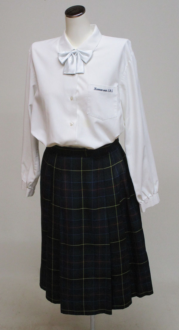 ブレザー:紺、胸ポケットに刺しゅう、シルバーサテンリボン付 スカート:緑×紺他チェック、ヒダBOX10本