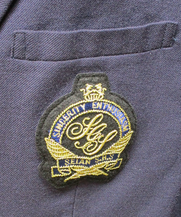 ブレザー:紺、前ダブル、胸ポケットにエンブレム付