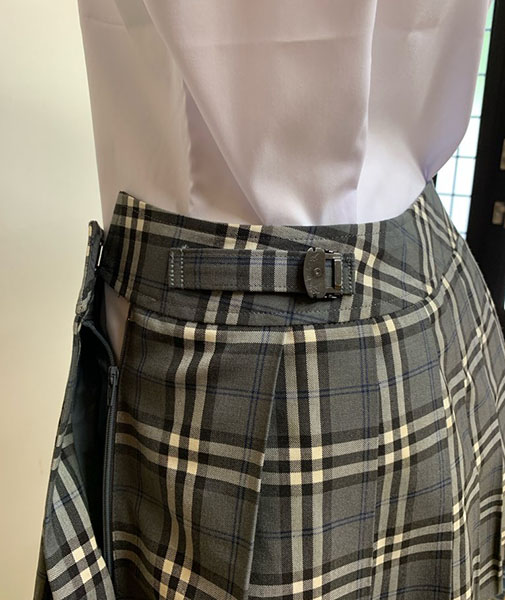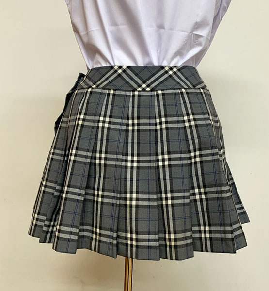 ポリエステル70%・毛30%、グレー×ブラック×ホワイト×ブルーチェック柄、ヒダ20本、ポケットあり、TOMBOW