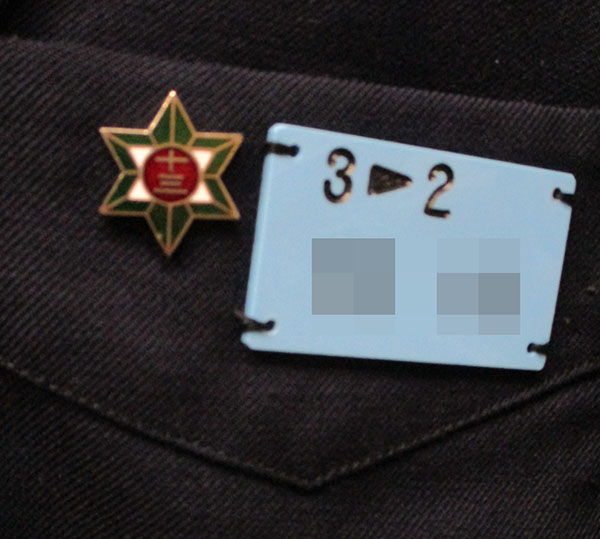 襟等に紺3本ライン、緑色スカーフ付、バッチ・名札付、サイドファスナー