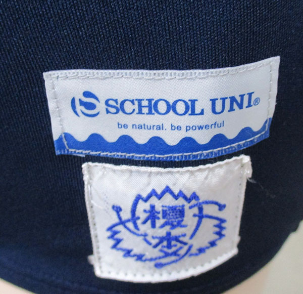 ポリエステル100%、記名あり、校章付、名札跡あり、紺